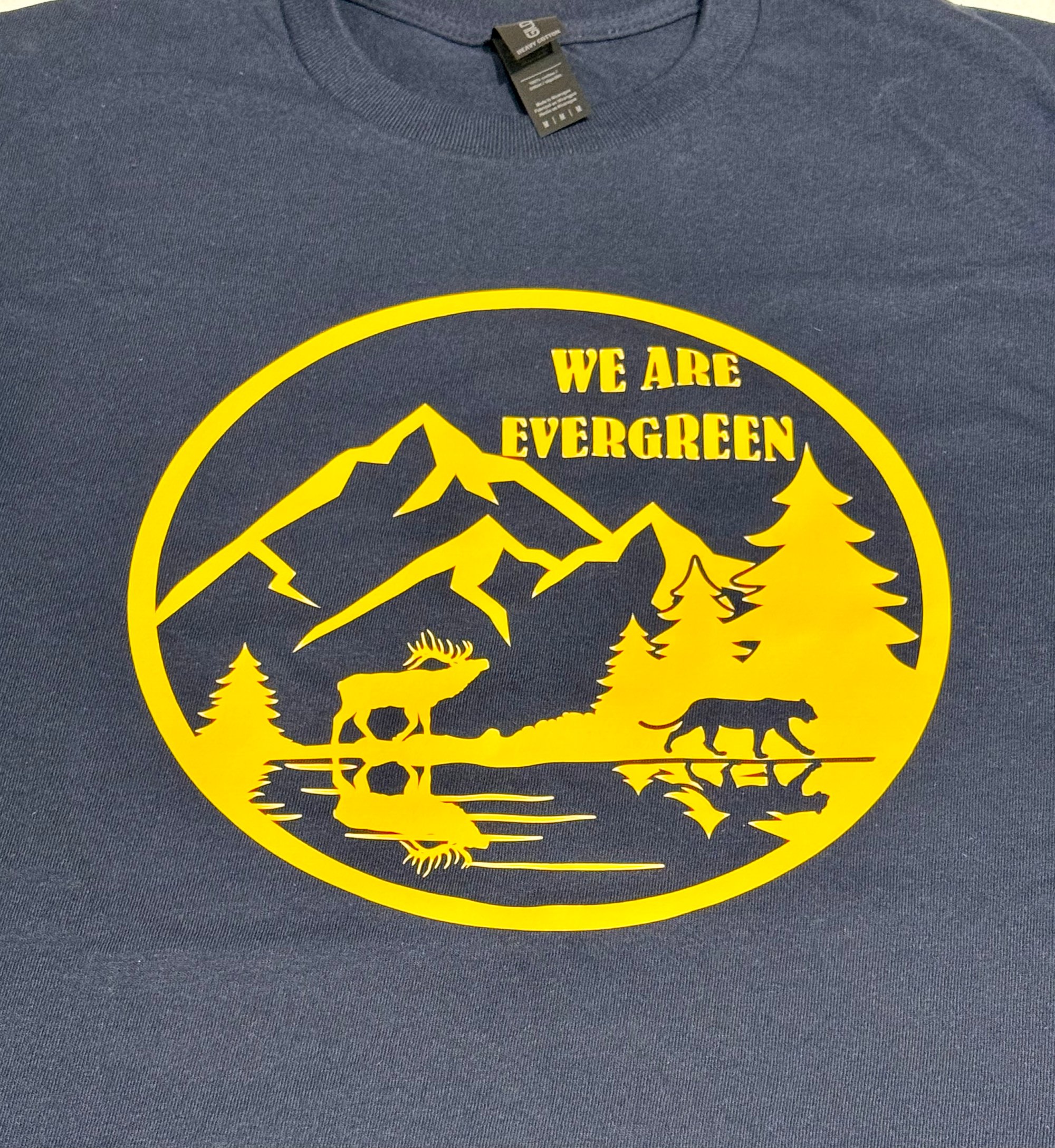 "We Are Evergreen" T-Shirts in EHS navy and gold. Logo on the front. We are so incredibly proud of our small mountain community and the support that was shown in time of need! Like so many others, we wanted to show our appreciation to all who helped usher our kids to safety. That is what community is all about. In honor of those individuals, "We Are Evergreen" was formed. Every shirt sold will donate 25% of the sale to ECHO to help with the food shortage.
